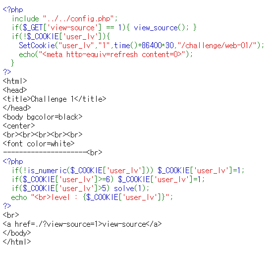 여기서 문제는 바로위의 조건을 본다면 COOKIE['user_lv']이가 6과 같거나 더 크면 1로 다시 지정해 줍니다.