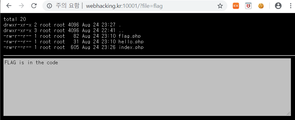 그러니 일단 flag.php 파일을 열기 위해서 주소창에 flag 를 입력해봅시다.