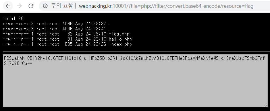 즉 이러한 php://filter 의 속성을 이용해서 flag.php의 소스코드를 확인해봅시다.