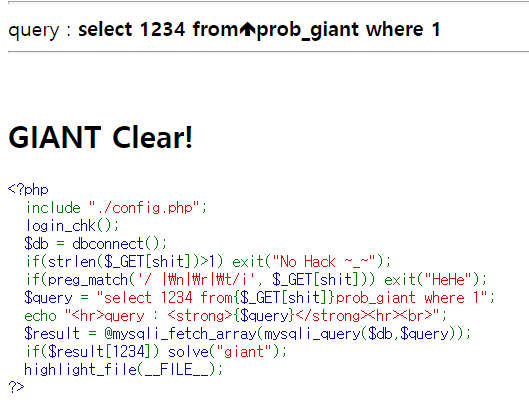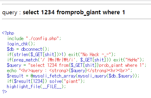 쿼리문을 보면 select 1234 from prob_giant where 1
